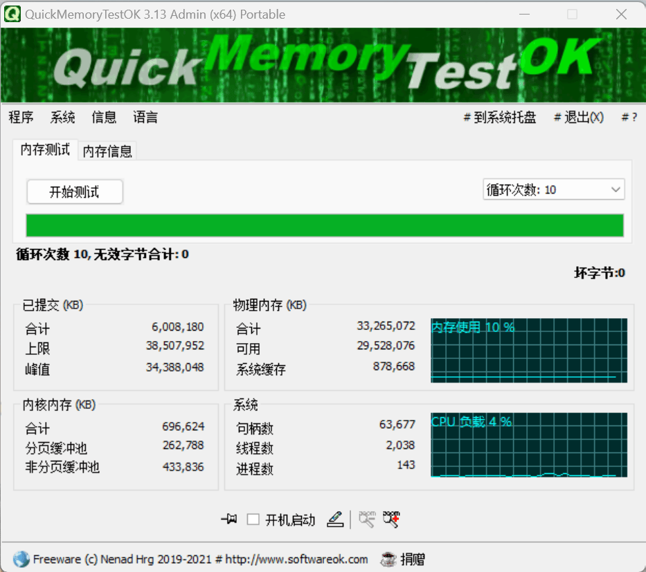 这里,我使用CPU-Z软件测试到内存条的最大带宽已经达到3600MHz,而且内存条采用的颗粒型号和运行时序等参数都可以清楚看到。并用使用QuickMemoryTestOK内存条专用的测试软件经过10个循环的测试,无效字节为0的完美结果也能看得出玖合星舞这款内存条在稳定性方面的出色表现。