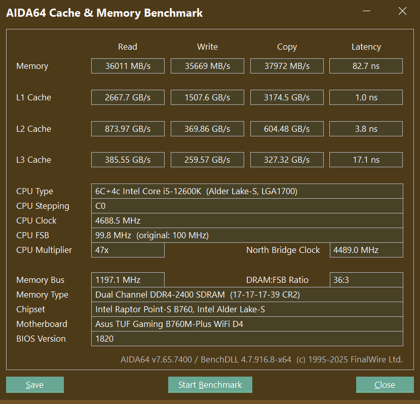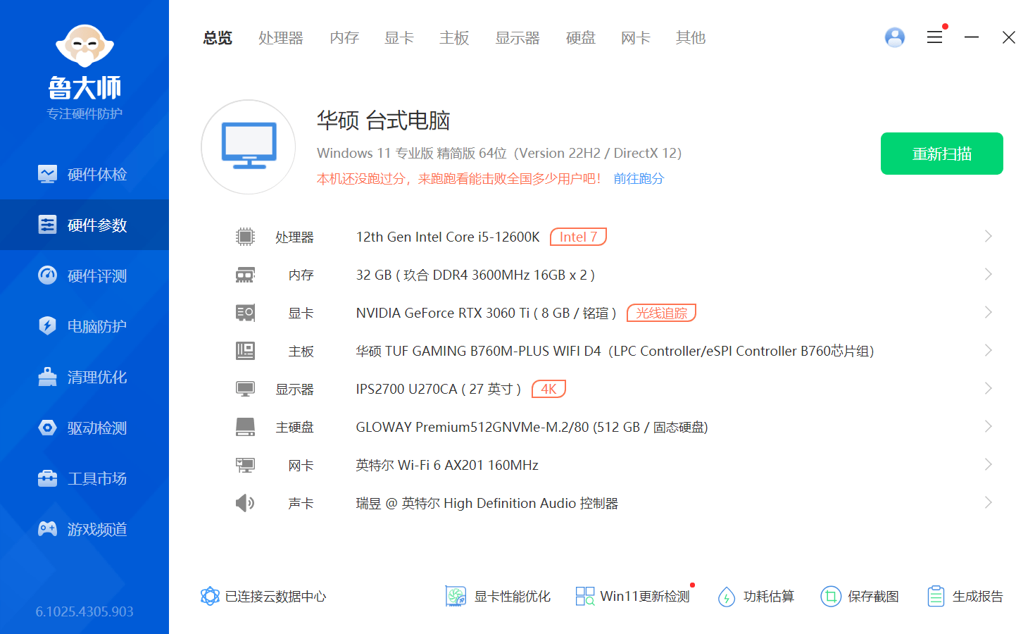 这次,我测试的电脑配置如下:处理器采用的是英特尔i5-12600K,显卡为铭瑄 GeForce RTX 3060Ti,搭配的主板是华硕重炮手TUF GAMING B760M-PLUS主板。这款配置现在已经算不上高端,但是充分发挥玖合这款DDR4内存条的强劲性能完成是没有问题的。