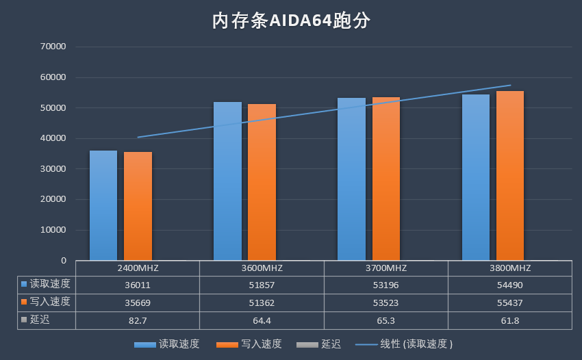 同时我也针对不同频率下通过AIDA64和鲁大师的跑分结果做成了两张图表,这样就能更直观的看到内存条在不同频率下的数据变化。通过测试我发现玖合星舞这款内存条运行在3800MHz下的跑分成绩和标称的3600MHz虽然只有几个点的提升,但各项数据表现都非常不错。我现在一直使用3800MHz运行,电脑性能和没开启XMP之前简直是判若两样。