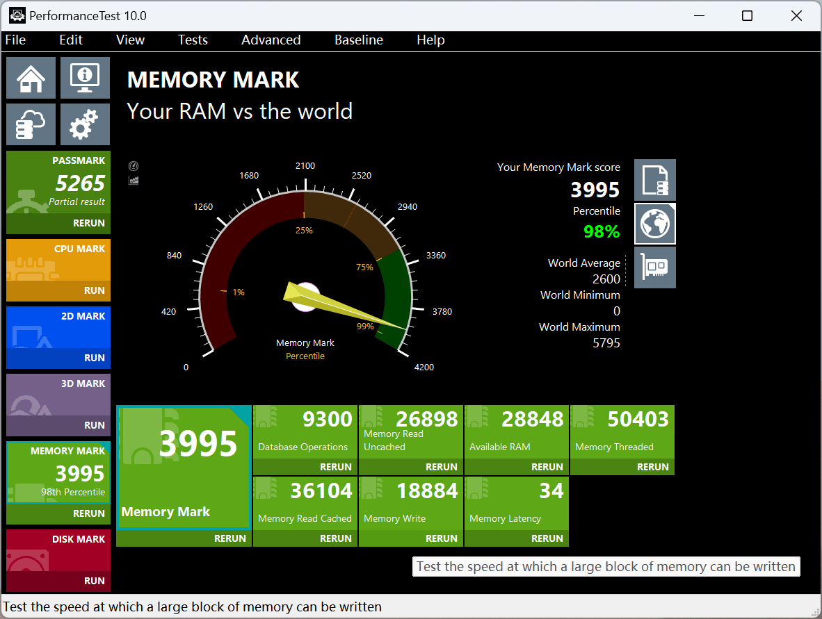 另外,为了测试这款内存条的稳定性,以及在高速运行下温度控制方面的性能,我在使用3800MHz的超频频率下,还通过FurMark烤机工具和PerformanceTest对电脑的运行稳定性进行了测试。最终结果这款内存条不仅能顺利通过高温测试,它在PerformanceTest测试下获得的3995分也是让我非常满意。