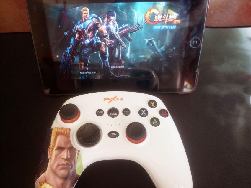 我选用了苹果的ipad 迷你来测试ios平台,在ios系统中需要安装乐炫游戏厅并从游戏厅中下载游戏才能支持手柄映射,我选择了一款纪念经典的新游戏“魂斗罗归来“进行测试。莱仕达天弓蓝牙版手柄对这款游戏支持的非常完美,不论是摇杆的灵活度,按键的反应速度都高于在屏幕上的虚拟按键,听着熟悉的音乐感觉有回到红白机的时代。