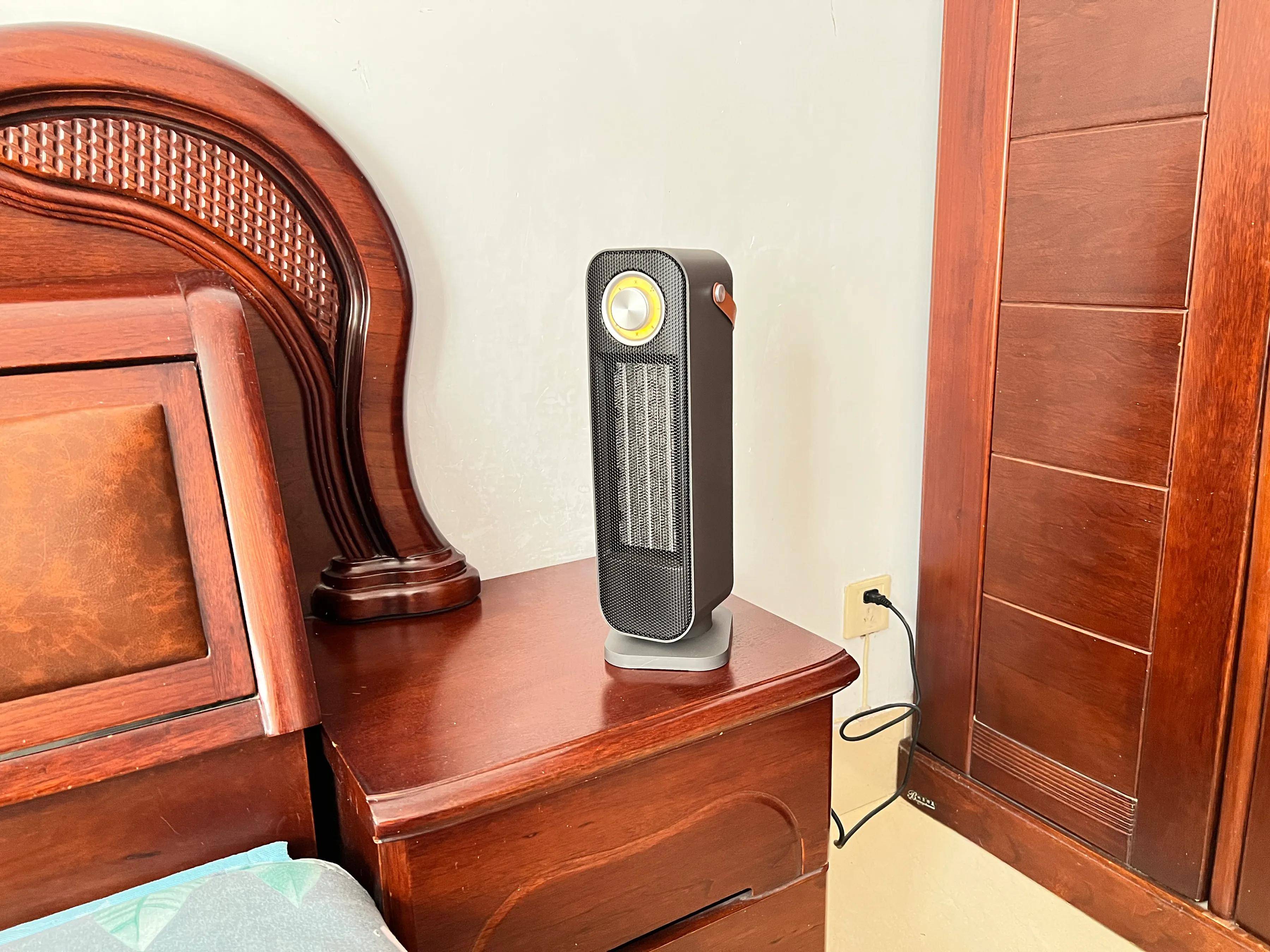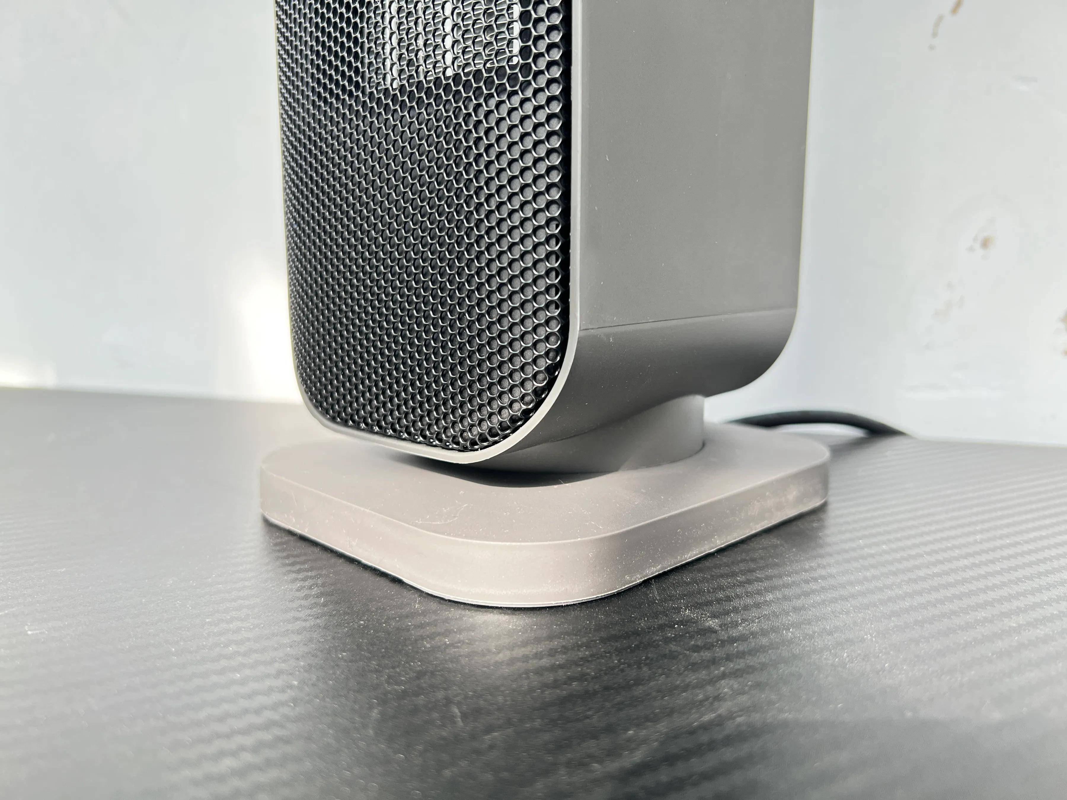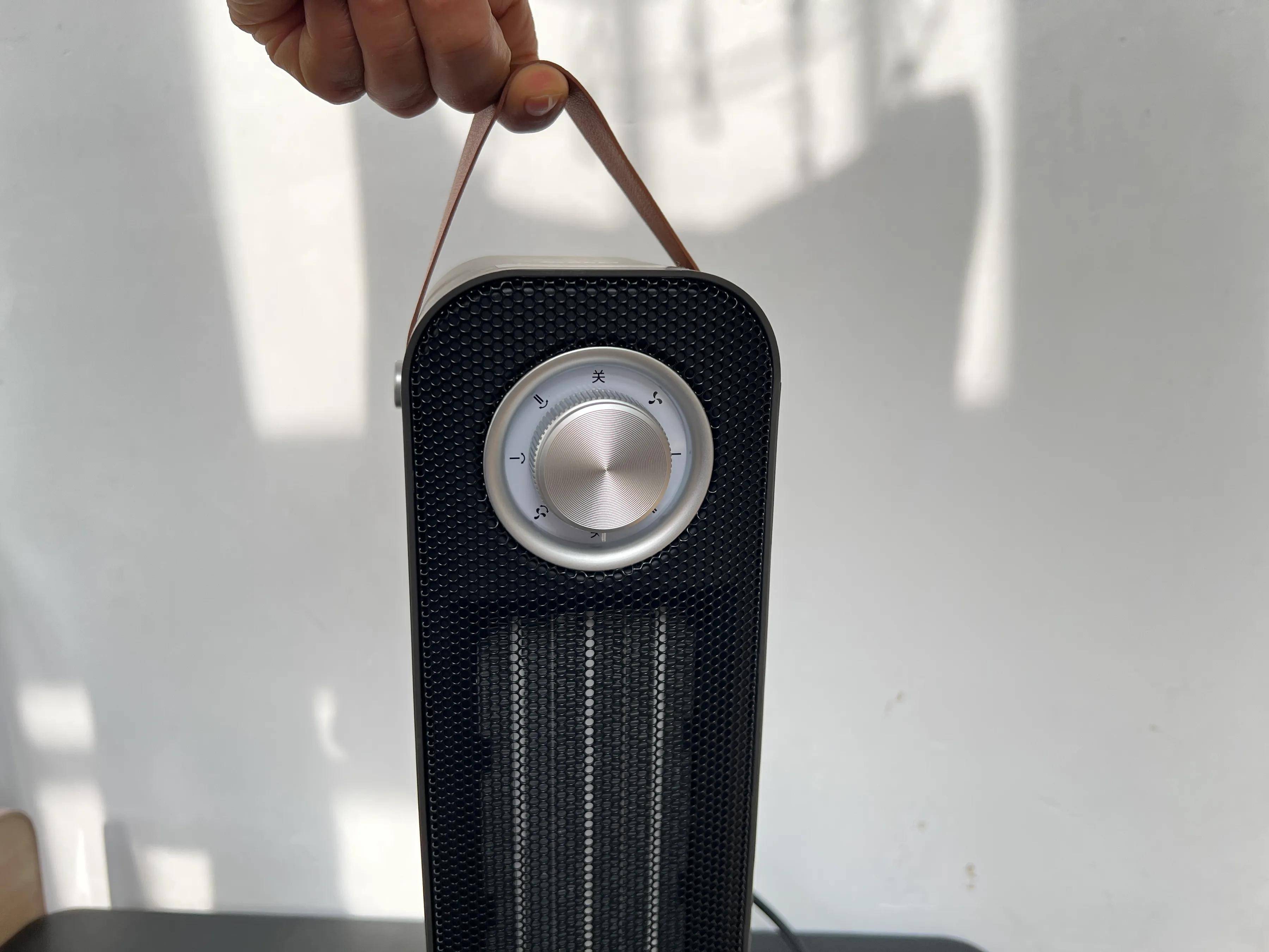 轻轻一提机身顶部皮革材质的提手,净重仅 3.2kg,女生单手就可轻松移动,比传统笨重的油汀方便太多了。晚上睡觉时放在床头柜上,平时放在办公桌上码字时用。由于暖风机底部设置了减震防滑垫,放在指定位置后不会轻易滑动,稳定性很好。再就是机身高度设计得也很合理,可以放在沙发旁或办公桌下面,不用专门为它考虑提供额外的位置。