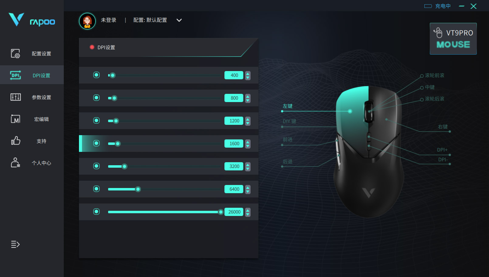 为了满足进阶玩家的自定义需求,雷柏VT9 Pro也有配套的驱动程序,功能非常丰富。在DPI设置选项中可以调节预设7档DPI的数值,也可以为10枚按键设定不同的功能。在参数选项中可以调节Windows指针的移动速度、滚轮速度以及USB报告率,不过只有搭配4K接收器以后才可以解锁4000Hz回报率。