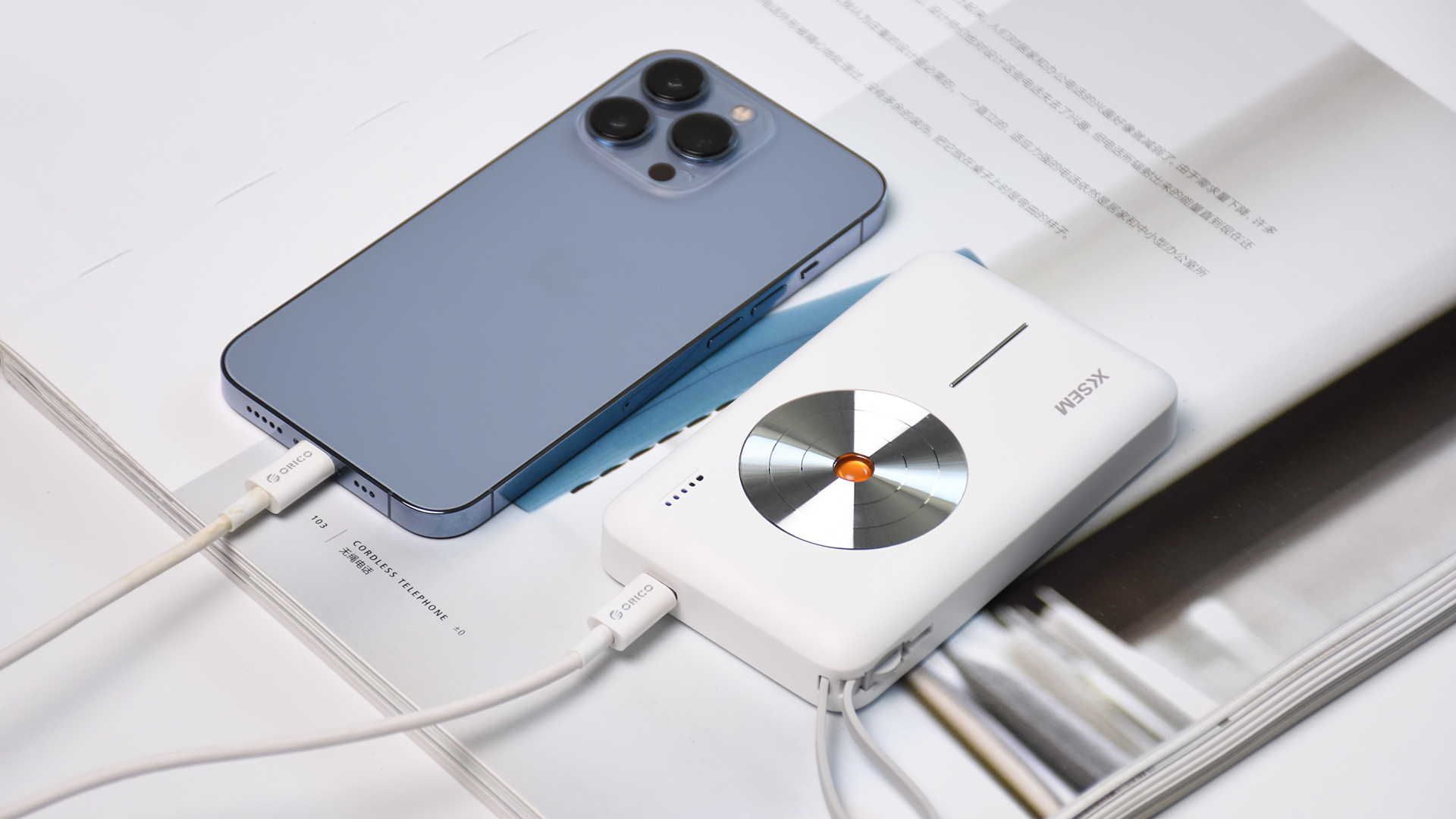 西圣PB无线充电宝的颜值非常高,白色的外壳显得简约干练,背部专门做了类似卡片相机的装饰,同心圆纹路金属片搭配中间的橙黄色指示灯,将时尚和复古两种风格巧妙地融合在一起,和上万块的iPhone搭配起来丝毫不显廉价感。