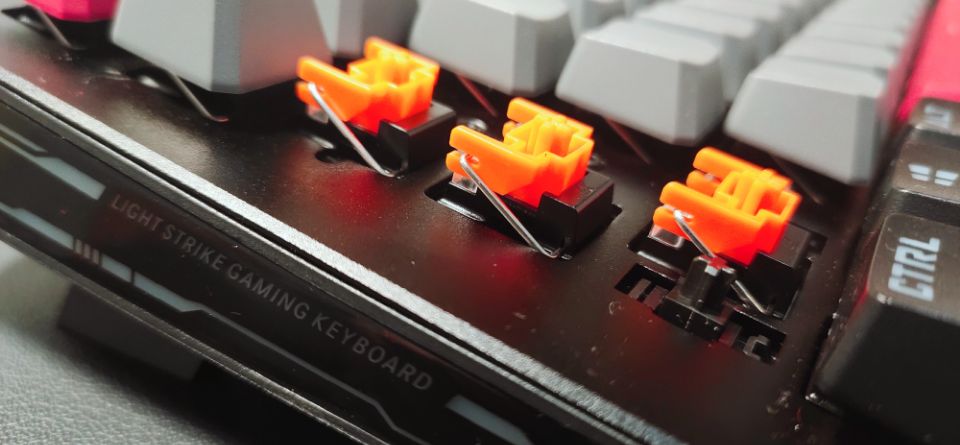 按键的每一次压下,都会触发一次红外感应限位,切断红外光从而对应按键输出信号。整个反应时长低至0.2ms,可以说是反应非常灵敏了。光导信号在一个优势就是干扰元素少,金属轴有时触点不接触或者是灰尘和异物等,容易导致接触不良,而光轴则没有这样的顾虑。每次激发都精准如初。