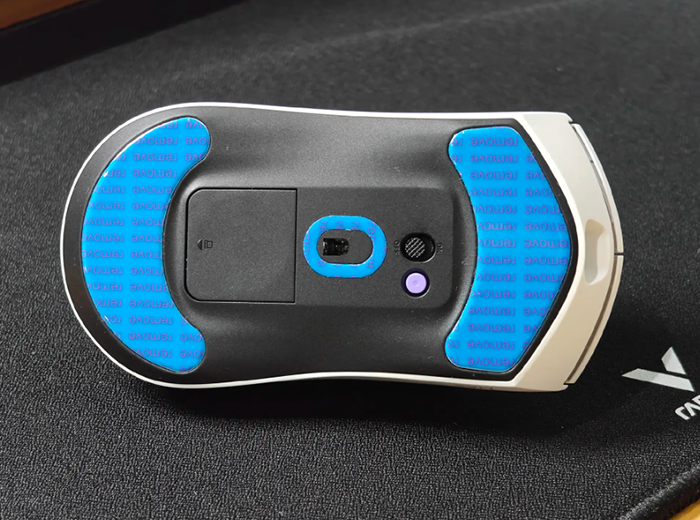 这种曲线美主要体现在三处,左右键的指间凹槽让鼠标在使用时,手指能稳稳的按压于凹槽处,提高了按键舒适性及命中率。其二就体现在两侧的微曲线条,而且左右曲度略有不同,让握姿比较贴手,满足了人体工学握持感。其三就是底部传感器周边做了曲面凸起,这些都是雷柏一直坚持的原创模具,特别适合大中手使用。