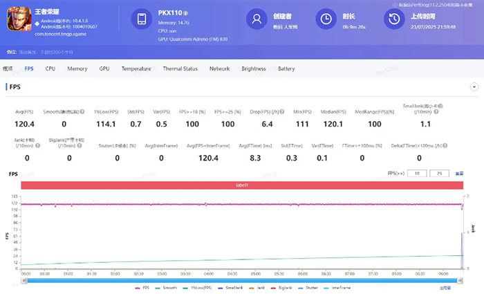不过最近手游的1%LOW帧也得到了重点关注,如果这个数据结果越高,也表明手机在游戏方面的表现将更加优秀。这里在使用全平台性能测试分析专家PerfDog 测试后发现,《王者荣耀》与《和平精英》的1%LOW帧分析可以达到114.1和58.2,特别是《王者荣耀》的优化非常给力,这样玩家在团战时更加跟手,从而也证实一加13T在手游方面性能表现的确很给力。