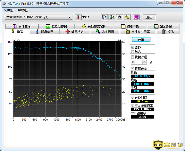 笔者用HD Tune Pro 5.6版测试了希捷3T监控盘的读取性能,最低76.8MB/S,最高140.1MB/S,平均128.2MB/S,这样的速度还是比较正常的。