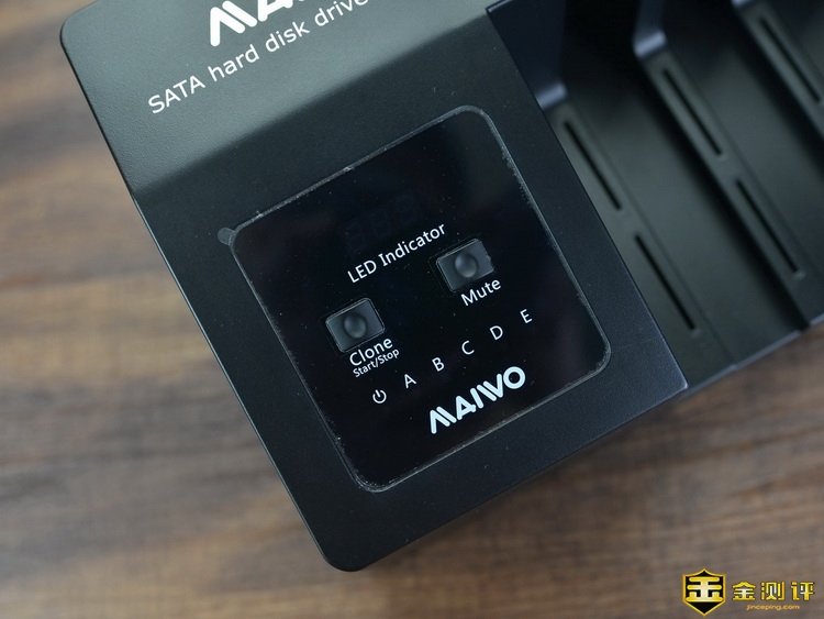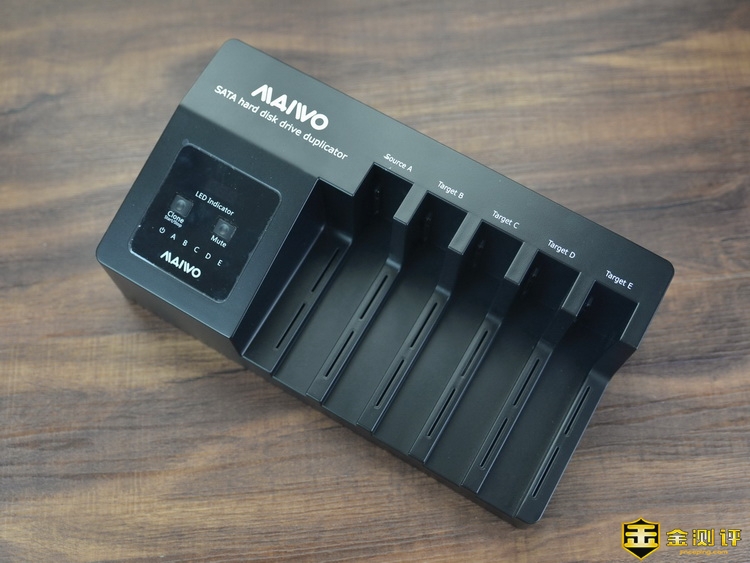 麦沃K3095A五盘位硬盘拷贝机具有5个盘位设计,所以体积还是比较大的,机身三维是410*260*185mm,重量约有1710克,机身采用ABS塑料和铝合金材质组成。机身左上角是麦沃的品牌Logo,左下叫部分是按键和指示灯的所在区域。5个盘位,在最内侧的盘位上标有Source,表示这个是源拷,在硬盘克隆的是哦户,源盘必须在这位置,其他四个盘位都是target目标盘。从左到右标注A-E顺序。