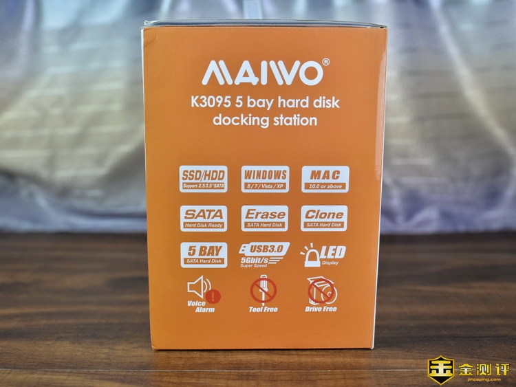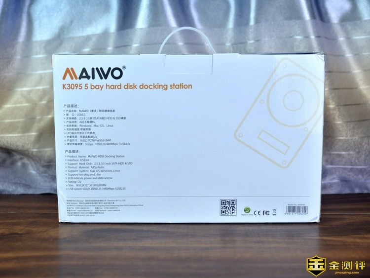 麦沃K3095A五盘位硬盘拷贝机的包装还挺大的,右侧是K3095A的实体图形,右上角是麦沃的品牌Logo,背面则是麦沃K3095A五盘位硬盘拷贝机的产品描述以及厂家的相关信息。侧面介绍了麦沃K3095A五盘位硬盘拷贝机相关的功能特点。