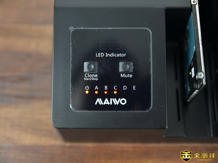 在机身左下角部分,这里有LED进度条,克隆开关,蜂鸣静音开关,电源指示灯和5个硬盘对应的指示灯。