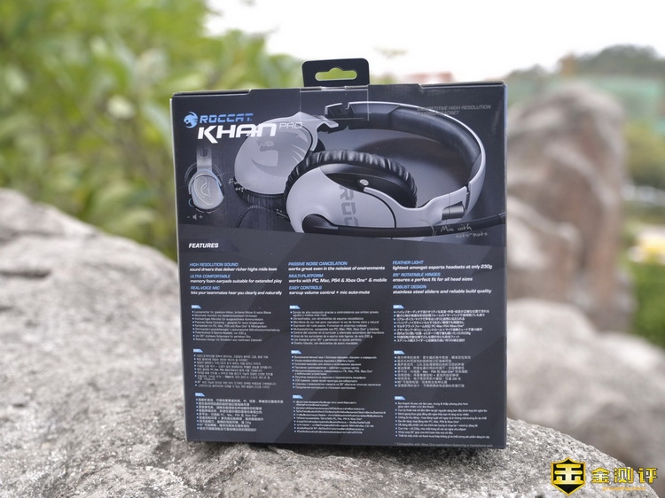冰豹ROCCAT® KHAN PRO Hi-Res高解析音频认证游戏耳机采用了相当精致的外包装盒,包装盒正面是冰豹ROCCAT® KHAN PRO Hi-Res高解析音频认证游戏耳机的实体图形,左上角则是冰豹的品牌Logo,左下角则是冰豹ROCCAT® KHAN PRO Hi-Res高解析音频认证游戏耳机最亮点的Hi-Res AUDIO认证。包装盒背面和侧面则是采用了多国语言,对于冰豹ROCCAT® KHAN PRO Hi-Res高解析音频认证游戏耳机的功能特点进行了详细的介绍。