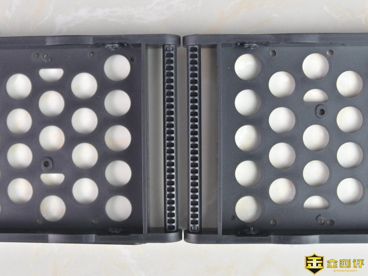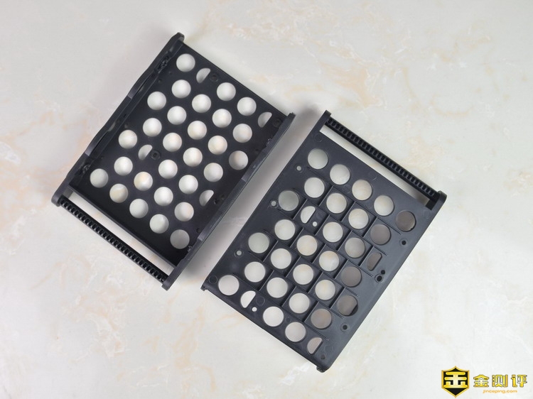 先河私有云服务器的硬盘架采用塑料材质,而且硬盘架上还开满了整齐的散热孔,为了避免开孔多,导致结构不牢固的问题,在硬盘架背面还做了稳固措施,这个设计,笔者觉得很好,既能保证散热,又能保证稳定。硬盘架上有2套螺丝空位,分别是用来固定3.5英寸和2.5英寸硬盘的。