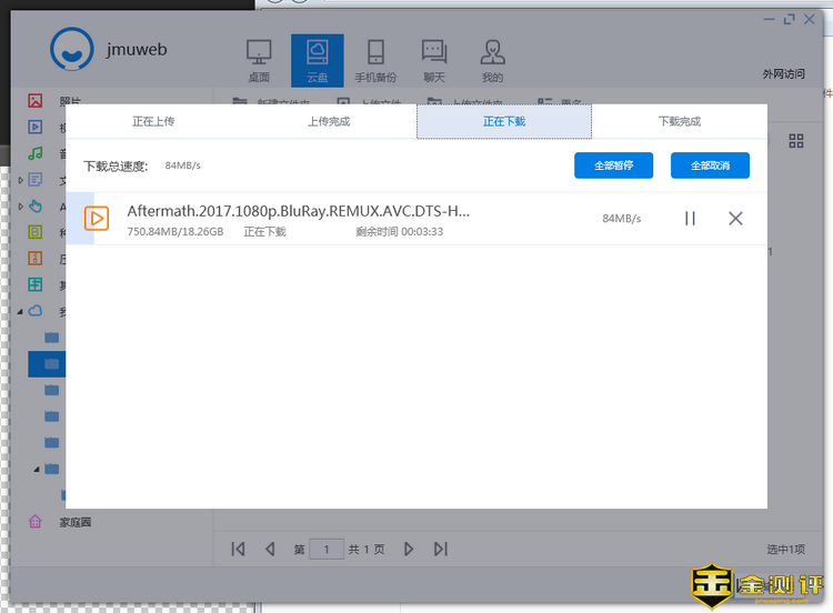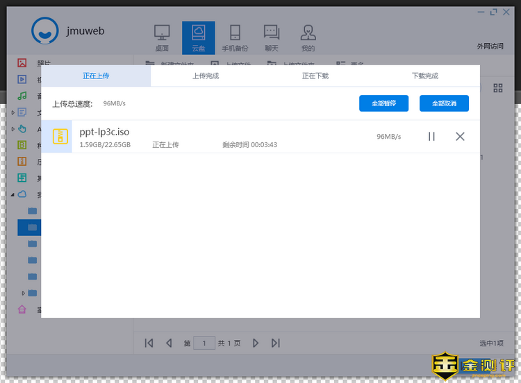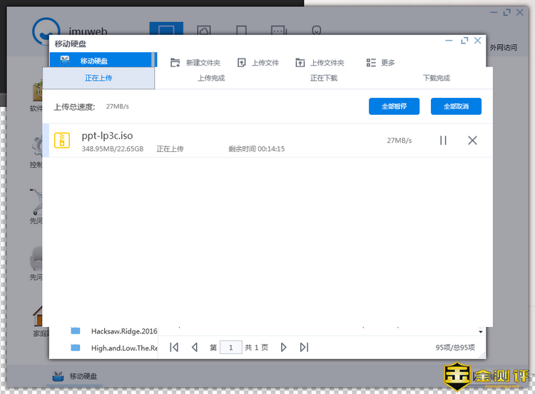 从本地硬盘上传文件到连接先河私有云服务器的移动硬盘上的速度仅有27MB/S,跟手机上传到移动硬盘的速度差不多。