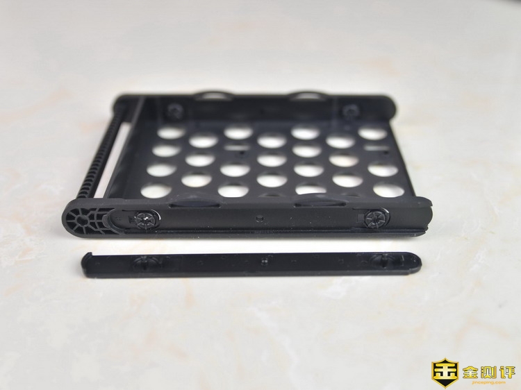 硬盘架的两侧各有一条可以拆卸的硬盘盒支架条,这其实是用来固定3.5英寸硬盘设计的,可以使得3.5英寸的硬盘免工具面螺丝安装使用。