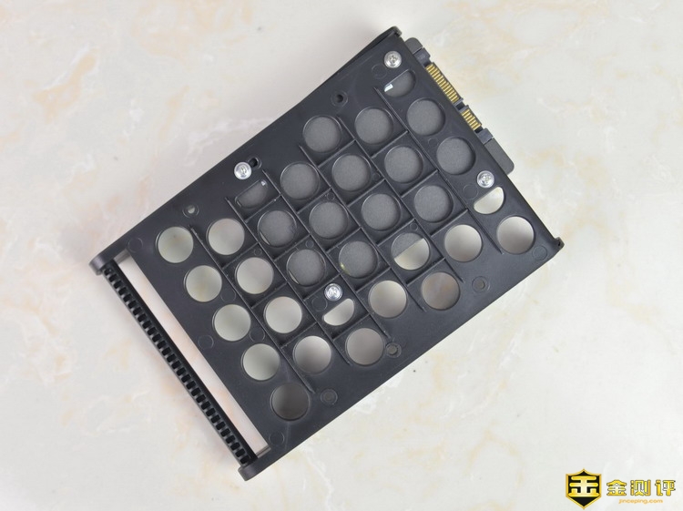 相对于3.5英寸硬盘的完美支持,先河私有云服务器的硬盘盒对2.5英寸的硬盘支持就不是那么好。首先不能免螺丝固定,好在笔者家里这些小零件很齐全,通过硬盘盒背面的孔位,对准硬盘的孔位,拧紧。