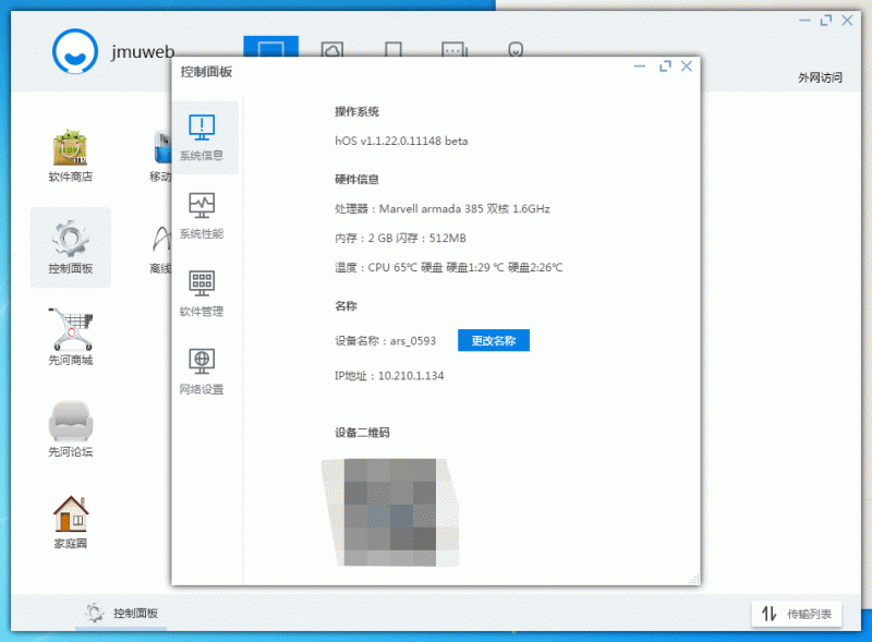 先河私有云APP进入主界面是就会开启手机自动备份功能,这点也是很方便。目前系统内有8大项功能模块,但是其中一些功能暂未开放,比如软件商店,先河商城,先河论坛这三项,这些要等后期更新了。控制面板里有系统信息,系统性能,软件管理,网络设置这四个小项目。系统信息主要是系统版本,硬件信息,硬件温度监控等内容。
