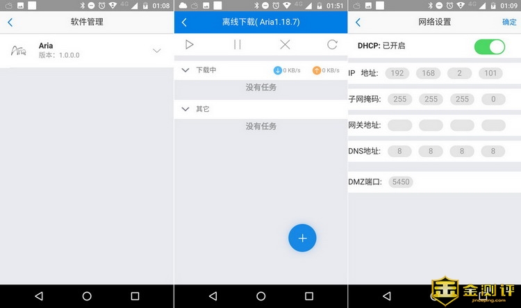 软件管理中,可以管理已安装的非系统软件。目前仅有一个离线下载用的Aria软件,这里笔者发现了一个小bug,软件管理中,显示Aria版本是1.0.0.0,而实际在使用的版本英是1.18.7了,没有同步更新。网络设置主要是设置先河私有云服务器的网络IP地址信息,笔者启用DHCP自动分配。
