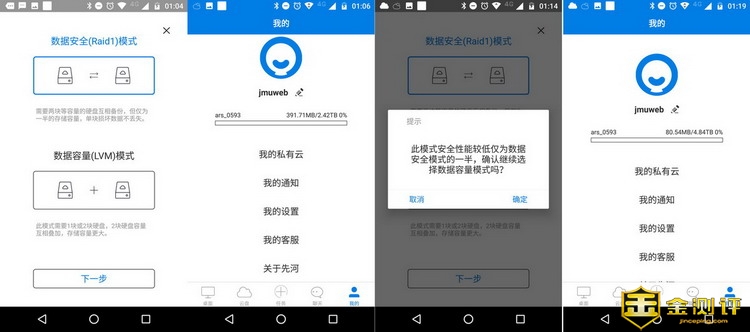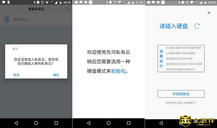 每一种NAS设备,都有内置的操作系统,这也是NAS功能强大的主要因素。先河私有云服务器搭载独家研发的基于LNMP架构的hOS操作系统,并且将所有功能都整合到了一个APP中,操作非常的方便。并且先河私有云服务器具有Windows,Andorid,iOS三种客户端,未来还会推出Mac端,涵盖各种设备使用需求。先河私有云的使用非常简单,首先需要通过扫描机身顶部的二维码绑定先河私有云服务器。绑定完成后,APP就会引导用户对硬盘进行初始化,笔者直接装入了2块3T的监控盘,所以可以选择数据更安全的Raid1模式和容量为主的LVM模式。
