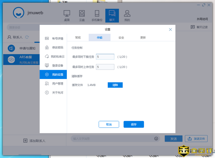 聊天是面向所有先河私有云注册用户,可以进行聊天和小文件传输。不过笔者发现windows端和APP端的聊天记录是不同步的,聊天记录可能是各自保存在本地的。在“我的”项目里的我的设置,这里比APP多了任务控制功能,可以设定同时进行的任务数量,最少1个,最多20个,这个就根据自己的网络情况量力而为了。