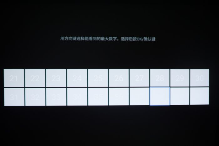 既然是测试的投影仪产品,那么画质是大家最为关心的问题,所以本阶段,我将使用安卓系统上的“电视屏幕检测”APP来进行一个简单的小测试。首先是灰阶测试。灰阶测试阶段分为2个测试部分,第一阶段是黑色方块测试,第二阶段是白色方块测试,每个阶段测试里的方块各有20个。在本阶段测试中,我能看到的最小数字是13,最大数字是40,最终测试的灰阶结果是“层次良好”。