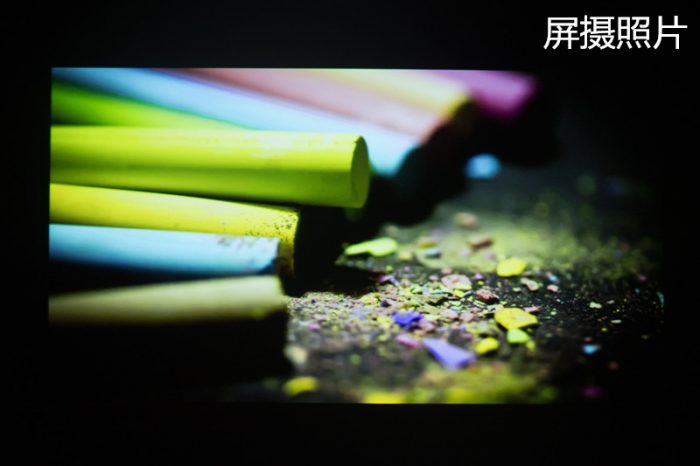 在清晰度测试方面,主要是我用肉眼进行了细致观察。酷乐视R4S本身的镜头分辨率可以达到1080P,远离屏幕墙1米左右位置可以带来非常清晰的画质体验。但是如果凑近仔细看的话,我发现屏幕靠近中间位置的区域显示是最佳的,屏幕靠左边的位置出现了明显的画质下降的感觉,但屏幕右侧区域依旧保持了较高的清晰度水准。不知道是不是个案还有待商榷,不过整体体验下来,画质表现良好,并没有影响到正常的观影体验。