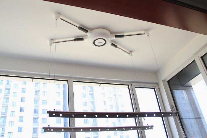 不使用晾衣机时,可以将晾衣杆升到最顶端。装饰效果不错,让呆板的房顶多了一份新意。