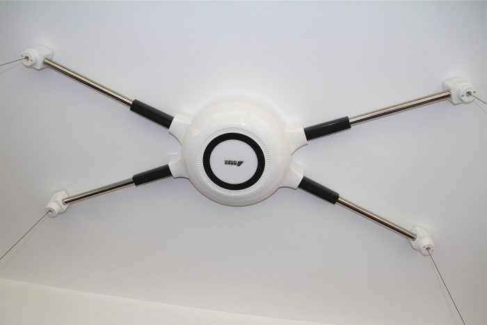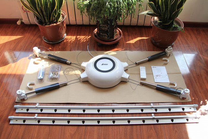 逆时针转动灯罩部分,可以打开灯罩,内部的电机、传动机构和控制系统一览无余,顶部白色齿轮上带有凸棱,正反向旋转时会触发其右侧的两个触碰开关,实现晾衣杆的上下两个限位。从内部还可以看到四个伸缩臂的灰色方管座插入主体的情况,为了展示右下角伸缩臂尚未插到位,其余三个已经入位。