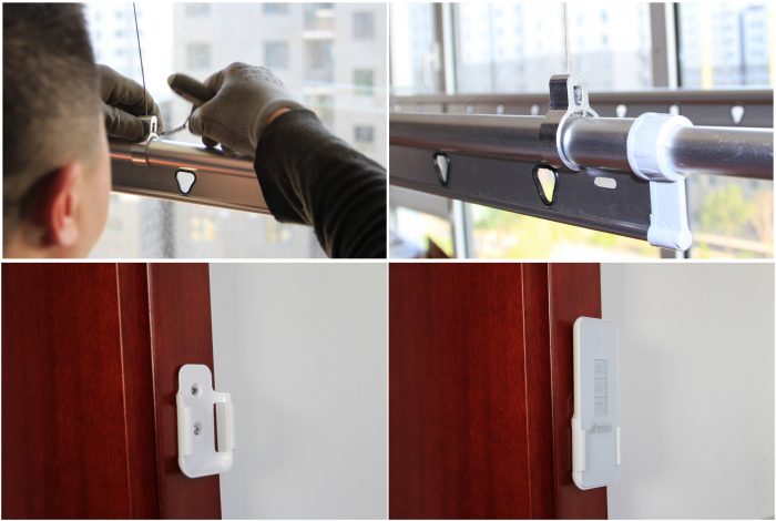 最后是晾衣杆和遥控器底座的安装,晾衣杆安装是只需将吊绳头弯折或转圈两次插入固定铝管中,然后用钳子夹瘪铝管即可。细心的人可以看到右上角图中的晾衣杆塑料堵头下部有裂纹,这是因为前面提到的无包装保护运输途中造成的,跟官方联系后,立马为我寄出了新的堵头。为了操作方便,我将遥控器底座用两颗自攻螺钉固定到了阳台装饰门套的外侧。