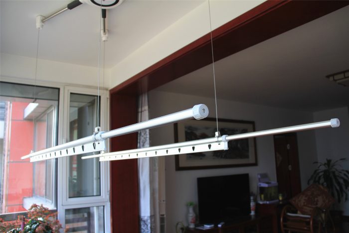 上部圆管两端还带有可伸缩的内管,以便于根据空间尺寸来调整,单边可加长0.5米左右,总长由1.4米增加到2.4米,大大增加晾衣数量。总承重为35公斤,足以满足五六口之家的日常晒衣需要。