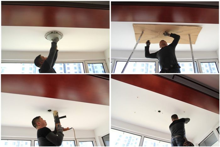 接着就是晾衣机的主体的安装程序了,依次是:连接电源——固定主机——固定吊头——扣上灯盖。