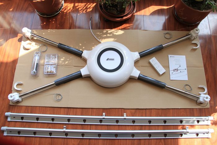 OK!前后不到一个半小时(这还包括因为首次钻孔时遇到了钢筋,重新划线调整了一次钻孔位置耽误的约二十分钟时间),晾衣机全部安装完毕,看着蛮漂亮的,整体来看犹如一只展翅飞行的蝴蝶。基于精巧的固定孔设计,整个安装过程简单轻松。