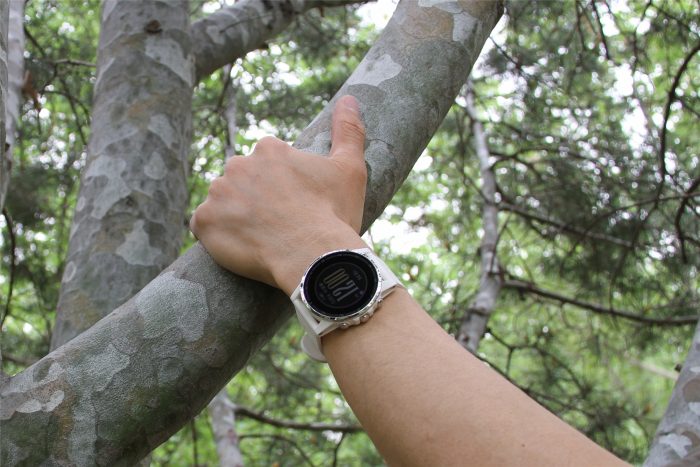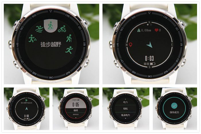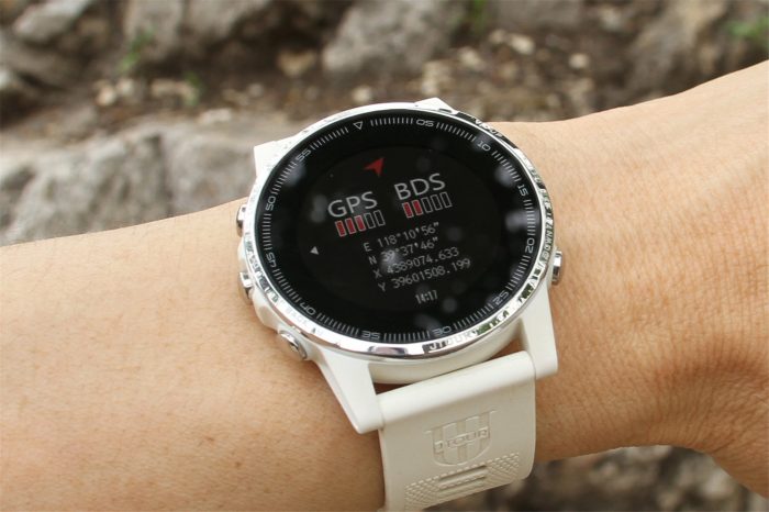 指北针打开即可使用,而卫星定位则需要稍稍等待,在开阔地的搜星定位速度相当快,说是秒搜有点夸张,分分钟(一分钟以内)定位还是没问题的,相比较于以往的导航仪和户外手表的搜星定位快了很多。搜星时最好抬起手腕,让手表直对天空无任何遮挡,不能靠近高大建筑物旁或在树荫下,哪怕是放在身体侧都可能会影响搜星的,搜到星以后就不怕身体或树荫的间歇遮挡了。