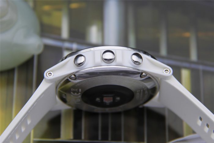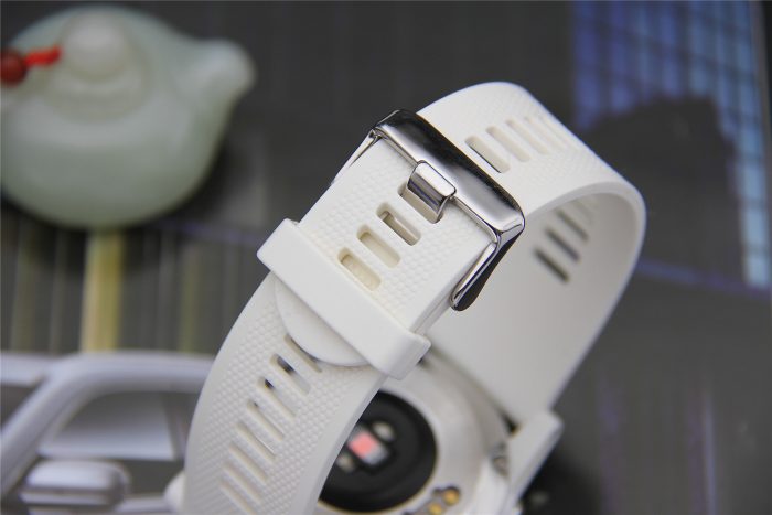 表壳依然是采用了军用级别的白色高合成塑料,轻便且更具质感。表耳侧面的采用了凹槽结构,减重的同时也增添了骨感。表壳与表带的连接采用不锈钢螺丝固定表耳栓,抗冲击、抗断裂和防脱开性能比普通弹性表耳栓要强太多,满足了野外恶劣的环境和高强度运动的使用需要。居中的OK键两边有两个保护凸台,防止这个最为突出的OK键在跌落或受到意外冲击时损坏按键或内部部件,足见细节设计考虑之周到。