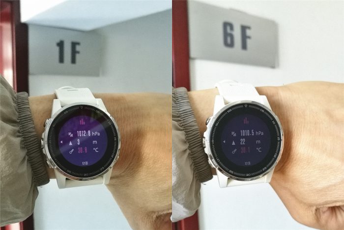 喜欢爬山的人对于海拔比较关注,铁腕5可以实时显示气压、海拔和温度等信息,使用中感觉气压和海拔数据变化还是反应灵敏和准确的,例如海拔高度根据位置高度变化实时显示。从办公楼一层爬到六层,高度差为19米,与实际高度基本一致(下图左为打开屏幕背光的效果)。