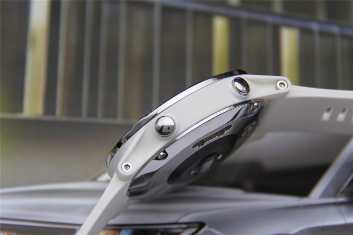 两边的银色不锈钢生耳螺丝头点缀在白色的表壳侧面,再加上银色表圈和底壳的衬托,使得手表的侧面造型更加富于变化,相比较于正面的中庸,更具动感。
