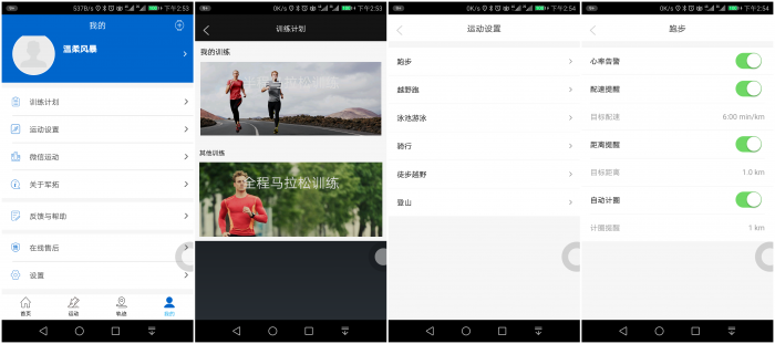 在“我的” 页面可以进行运动计划选择、各种提醒、反馈信息、绑定设备和编辑个人信息等等个性定制操作。你可以选择训练计划,不过目前只有半马和全马可选,尚不能自行修改和制定。另外,也可以根据需要对不同的运动类型分别进行个性提醒设置,如跑步的心率告警、配速提醒、目标配速、距离提醒、目标距离、自动计圈和计圈提醒,除此之外,还有骑行的速度提醒、徒步越野的燃脂目标和登山的高度提醒等等,以满足不同人士的个性需要。