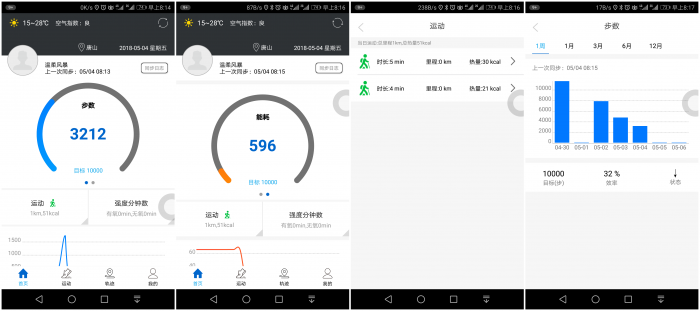 在“首页”页面可以查看天气信息、同步日志、运动步数和目标值、能耗值和目标值、运动强度、分时运动步数曲线,以及运动记录和周月年的步数统计图等。