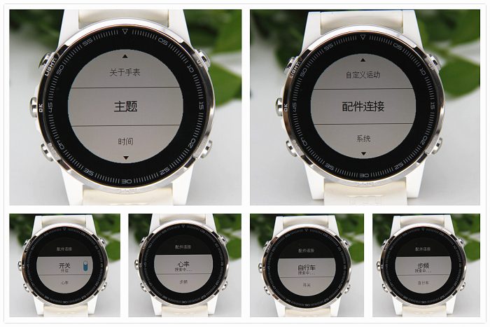 在待机界面按ok键可调出设置菜单进行主题、时间、运动记录、自定义工具、自定义运动、配件链接、系统设置等,以及查看手表软硬件版本信息等。虽说这些都是手表本身基本功嫩,操作也相对简单,之所还要说一下,其实是为了说一下它的配件连接功能,铁腕5 特意添加了此功能,为了将骑行爱好者的踏频器或者是心率带等专门设备的数据也统一整合到军拓手表和APP里来进行分析,不用需要再分别安装多个app分别进行统计分析了,方便了许多。