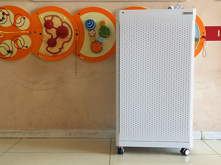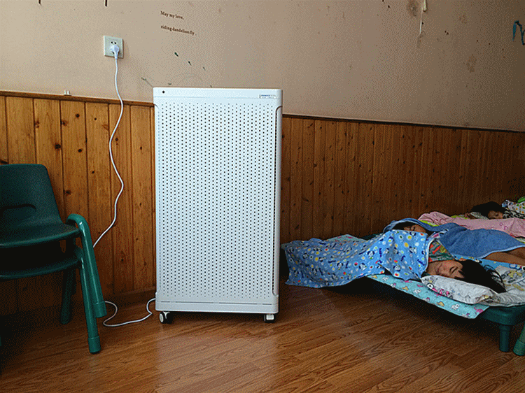 不过条件所限,招财猫所在的幼儿园一间教室相当于家居中2间主卧的面积,招财猫打算就用咱们这间“法国班”教室作为X8各类测评体验的场地了。大家可以看出把X8放置在教室办公桌的墙边,并没有显示出X8有多大,分离式的电源和超长的电源线让X8移动和使用起来也算非常方便,下面招财猫要带着大家“畅想每一次健康呼吸”啦!