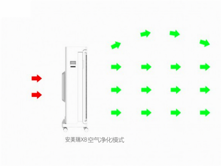 安美瑞X8之所以能够如此之快的完成室内空气净化的任务,归根到底是其最强悍的风机数据、五大过滤机制和优秀的空气净化模式。X8顶部前侧和机身背部都设有出风口,完全实现了上、前、左、右四个方向的环抱式出风,支持全方位的快速循环。X8后进前出的风道设计优点就是同等风力、功率下噪音更低体积更大,空净效率更高。