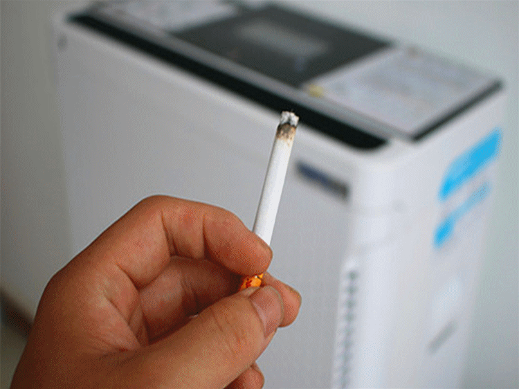 封闭的教室内一只香烟正在燃烧,烟雾缭绕非常呛人。检测设备上的各类数据飞速的上升,其中甲醛的浓度已经接近机子报警的极值,pm2.5的数值也已经由合格的绿色变成了红色。当第二根香烟燃尽时检测设备甲醛值开始报警了,此时的甲醛和PM2.5值已经是0.278mg/m3、999μg/m3爆表了。