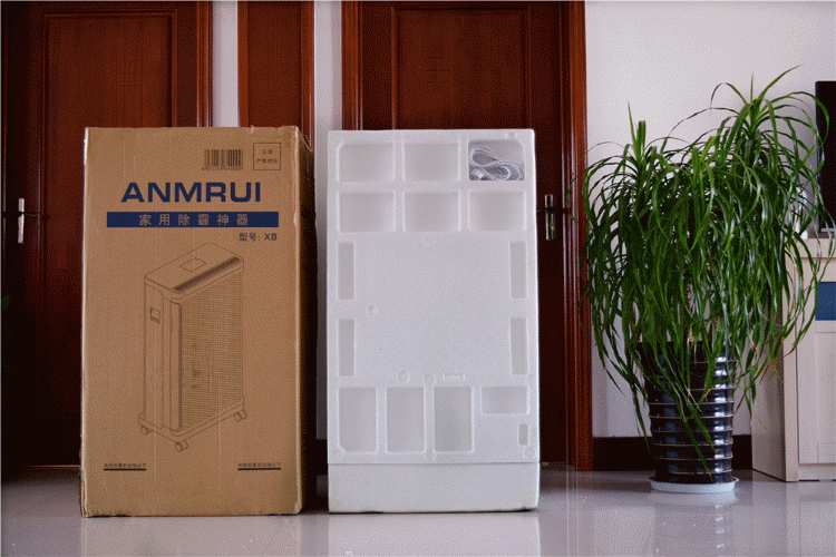 安美瑞X8除二手烟版采用硬纸壳包装盒,给我的第一感觉就是大,然后就是很重,想要一个人搬运还是要有些吃力的,包装盒正面是产品的实物宣传图、特色功能和产品名称。