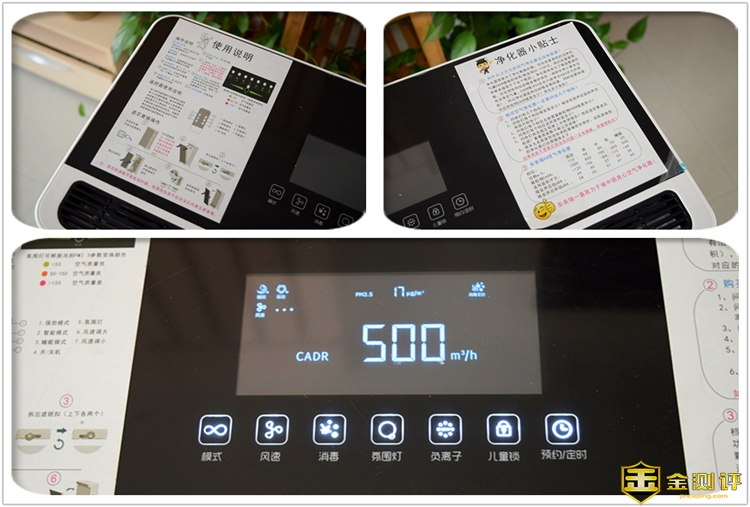 安美瑞X8除二手烟版的顶部采用黑色的面板设计,左侧贴有使用说明,右侧贴有净化器小贴士,用户即使不翻看使用说明,也能够快速掌握净化器的使用方法。机身顶部还拥有一块LED屏,可以显示详细的数据,另外在屏幕下方还拥有模式、风速、消毒、氛围灯、负离子、儿童锁、预约/定时和开关共8枚触控按键,可以便于用户快速对净化器进行控制。