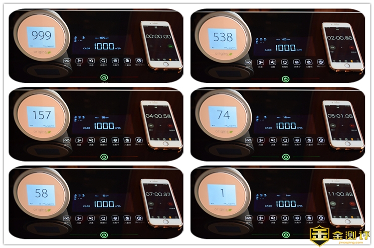 当净化器“极速模式”开启之后,噪音还是比较明显的,不过净化效率也是很强悍的,仅仅经过了2分钟,室内的PM2.5浓度已经从爆表的999迅速降为538,当净化器运行4分钟后,室内PM2.5值降为157,运行5分后PM2.5值已达到了74,经过了8分钟的全效工作,室内的PM2.5值已经达到58,最终经过了11分钟,室内的PM2.5值降到了1,和手中空气检测仪的测试数据保持一直,此时室内空气已经被净化了遍。