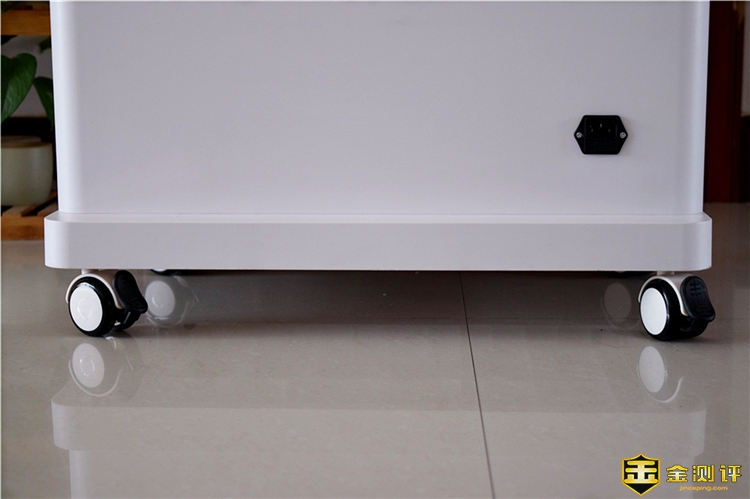 由于安美瑞X8除二手烟版的体积较大,在净化器底部放置了四个万向滚轮,可以便于用户轻松移动机器,根据需要在各个房间之间移动使用,另外四个脚轮都带自锁刹车,上提脚轮扣解锁,下压脚轮扣锁定,可以让机器平稳固定。