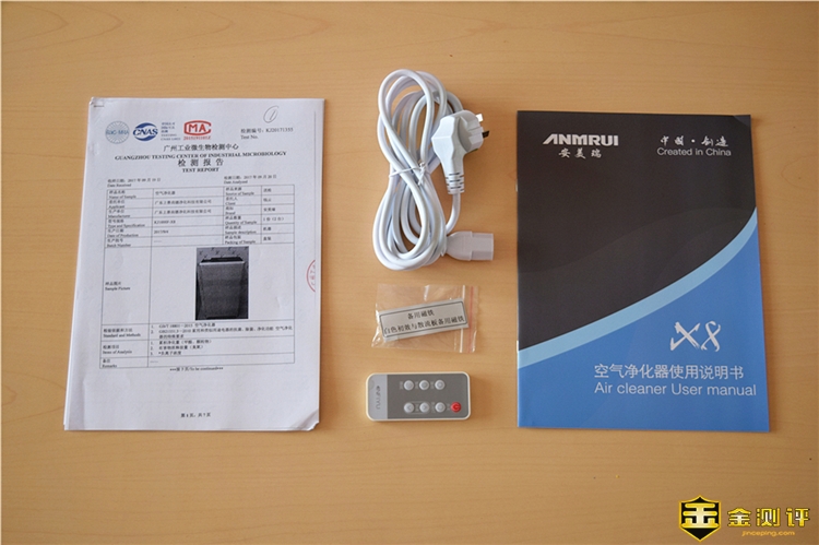 在包装盒的顶部放置着使用说明和遥控器,电源线被放置在侧面泡沫隔断中,和其他净化器不同之处,安美瑞X8除二手烟版还配备了来自广州工业微生物检测中心的检测报告,这个在以往的净化器中也是并不多见的,也可以看得出厂家对于自己产品净化器能力的自信。