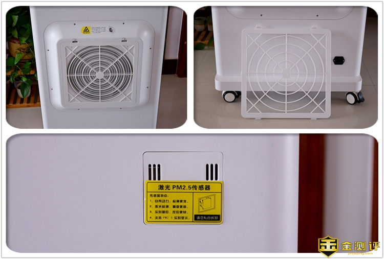 进风口采用了双层导风罩设计,另外初效过滤网也被放置在了此处。在机身背面的右上角为高精度激光PM2.5传感器,具有实时响应快速、0.3μm分辨率和防絮设计等功能,右下角的位置是电源插口。
