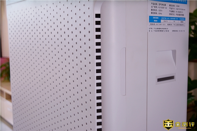 安美瑞X8除二手烟版的外壳采用ABS树脂塑料材质,正面被密集的小孔占据,上下出风口为小孔,中间部分采用稍大些的孔,可以让出风面板整体出风更均匀。在正面出风面板的左上角为红外接收器,可以让用户在距离机器6米范围内使用遥控器,不过需要站在净化器正面才能获的更好的使用效果。