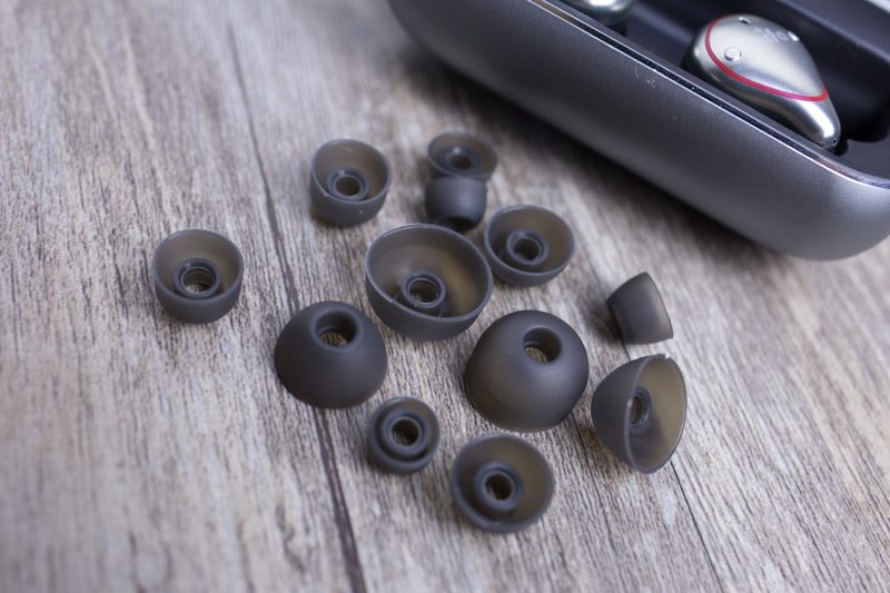 打开盖子可以看到里边物品摆放很规矩,耳机单元不是直接放在充电盒子里,而是放在了充电盒子两侧,比较直观,充电盒子上方摆放的是说明书、耳套、充电线等配件。
